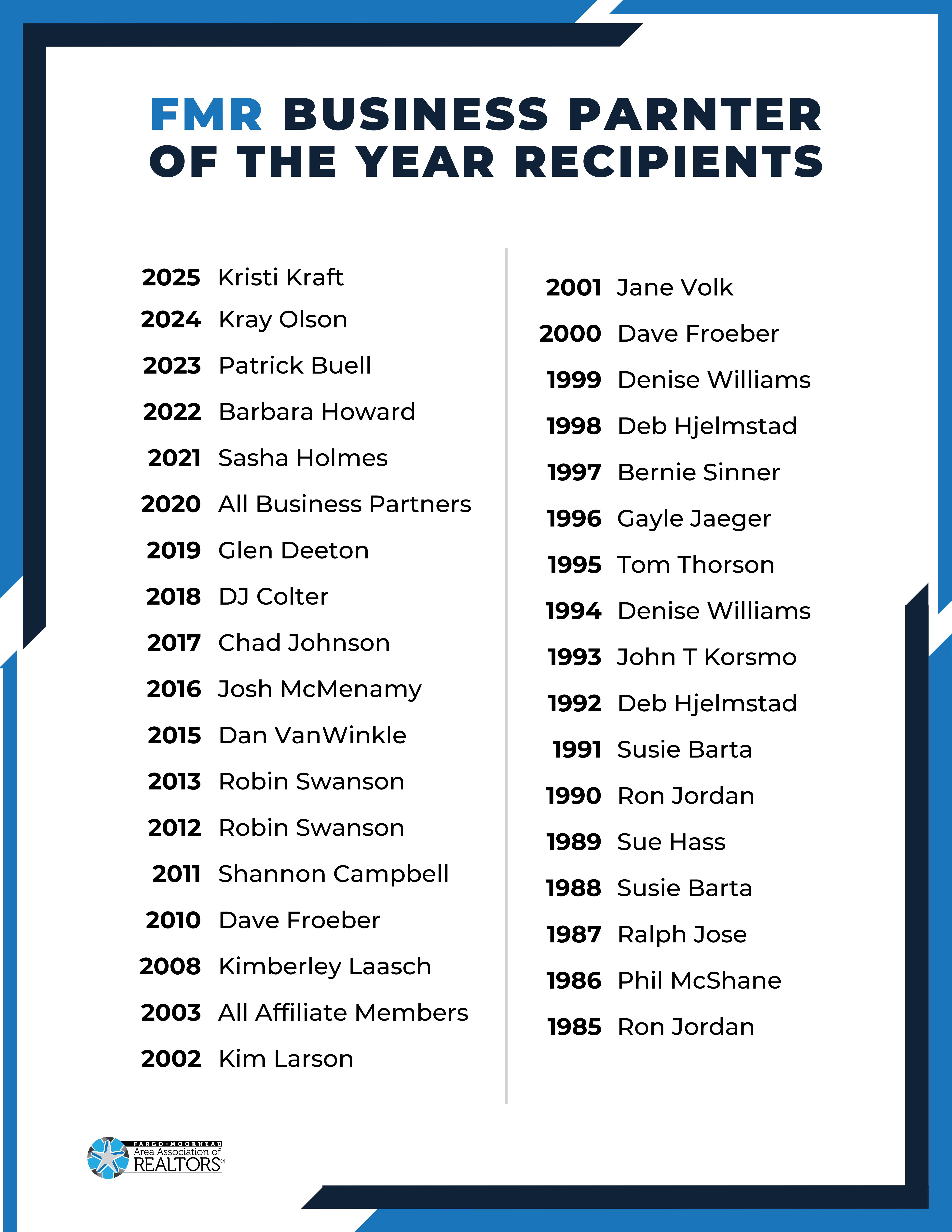 The Business Partner of the Year Award is a prestigious honor presented to an FM REALTORS® Business Partner member. The award is based on involvement with FM REALTORS®, including committee work and leadership, participation in civic activities, and professional accomplishments.